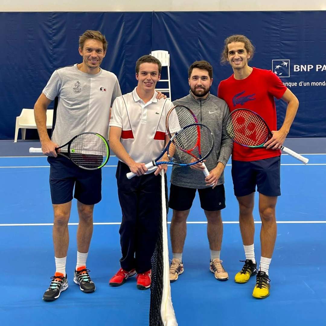 Arthur et son coach avec les champions du double Herbert et Mahut