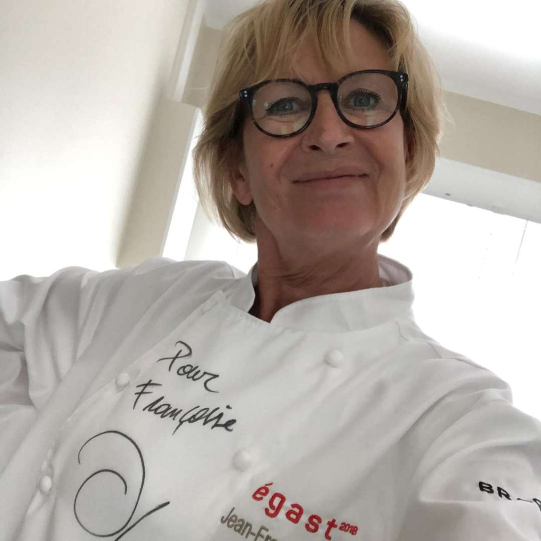 Françoise avec le tablier dédicacé du chef Jean-François Piège