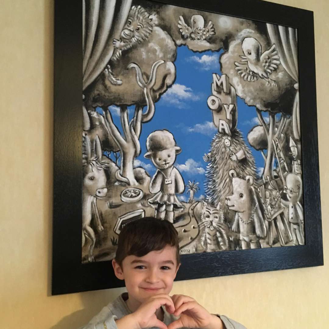 Cyril, en famille devant son œuvre d'Aki Kuroda
